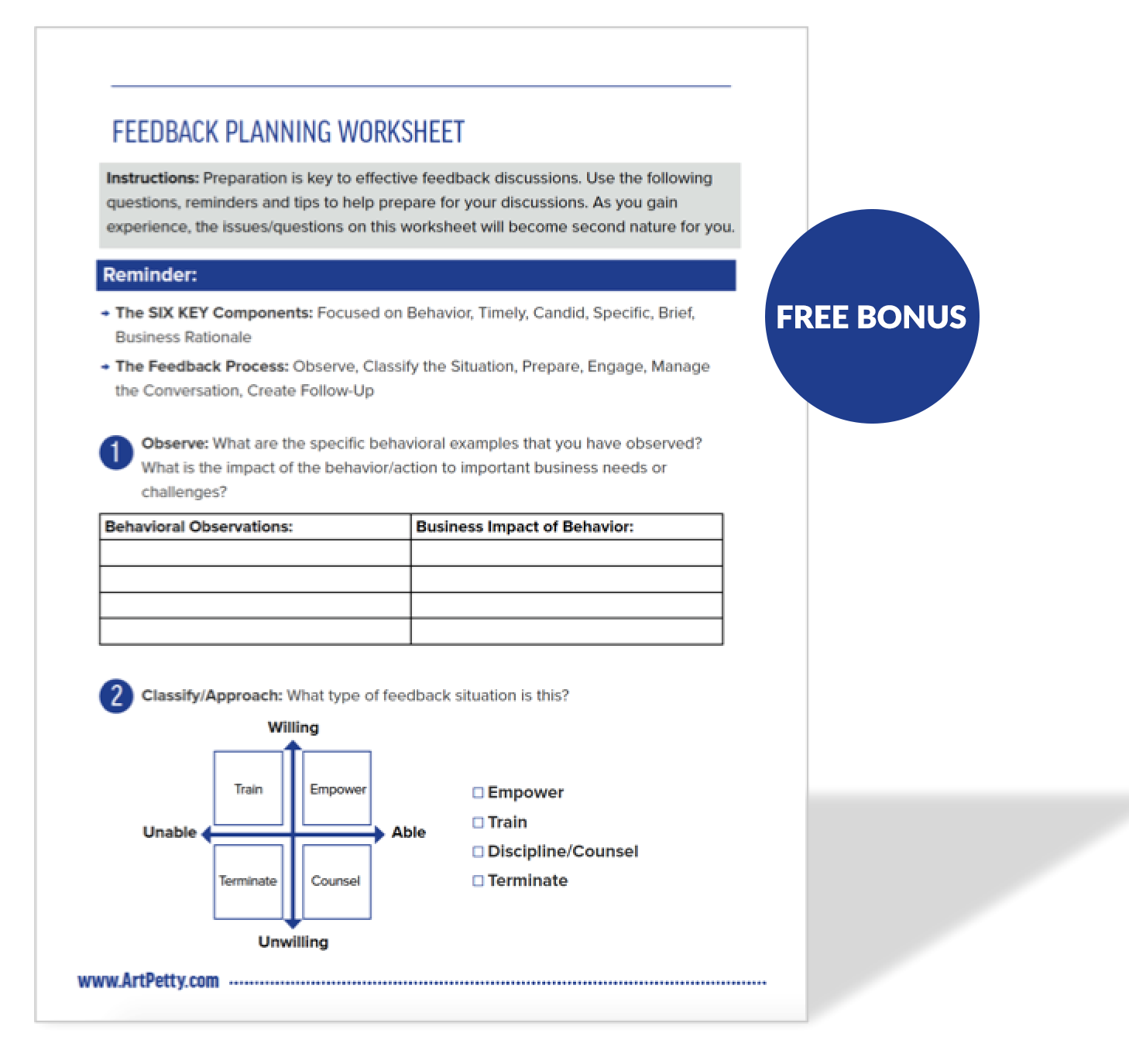 Preparation is key to effective feedback discussions. As a bonus for joining the Succeeding with Challenging Conversations, you’ll get my Feedback Planning Worksheet for FREE. You can use the worksheet that’s full of questions, reminders and tips to help prepare your discussions.